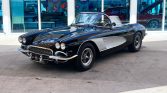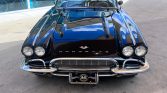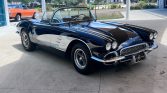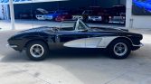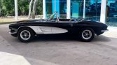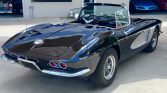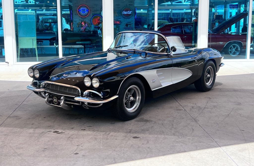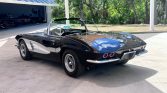 This meticulously restored 1961 Corvette Convertible showcases a striking black paint job with silver coves, reflecting its classic appeal. It features a numbers-matching 283 cubic inch engine with factory dual quad carburetors, an aluminum intake, tube headers, and dual exhaust. The engine is housed in a detailed compartment with a reworked radiator and fan system, paired with a 4-speed transmission.
