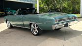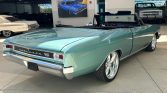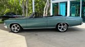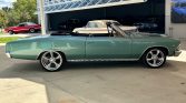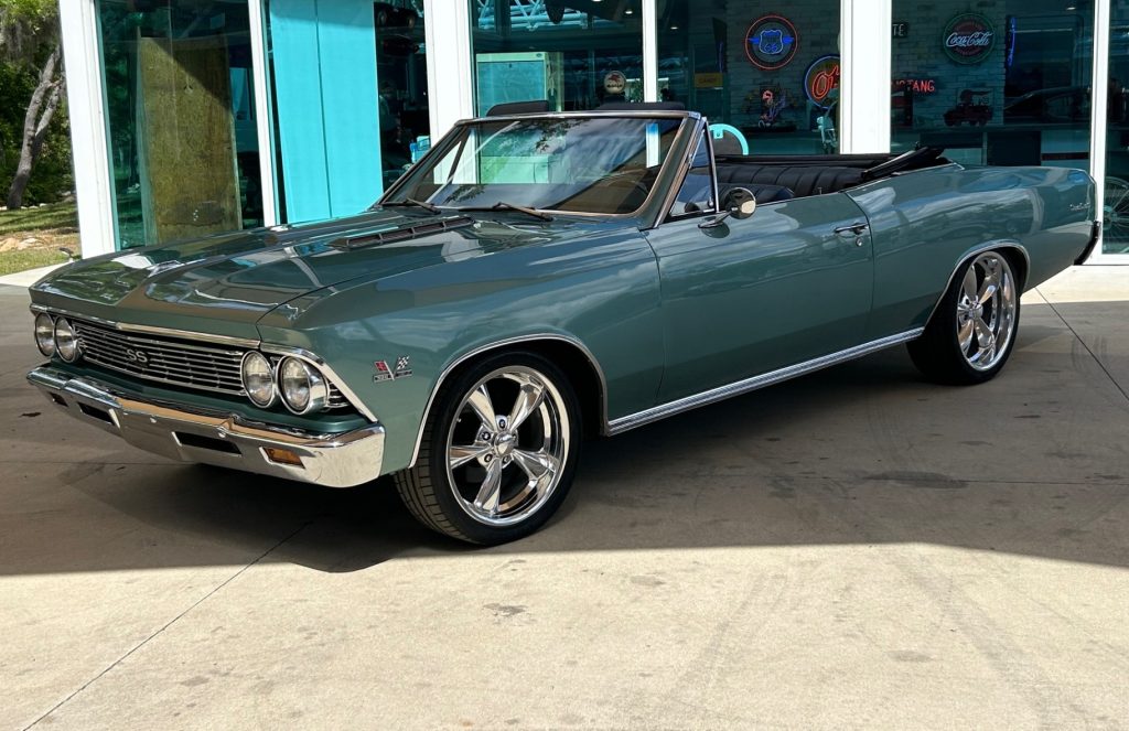 The exterior of this Chevelle is finished in a striking teal paint job, highlighted by the iconic SS hood and prominent SS badging. The convertible top is a HARTZ black cloth, offering both style and practicality. The car rides on Billet Specialties custom wheels with black sidewall tires, enhancing its muscular stance.