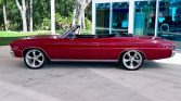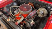 Externally, the car is painted in shiny red with a black power convertible top and boot. The SS hood features chrome power bulges, enhancing its muscle car appearance. The overall presentation is complemented by excellent body panels and fitment, adding to its striking visual appeal.