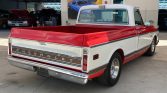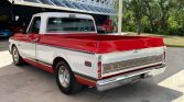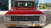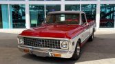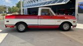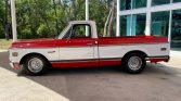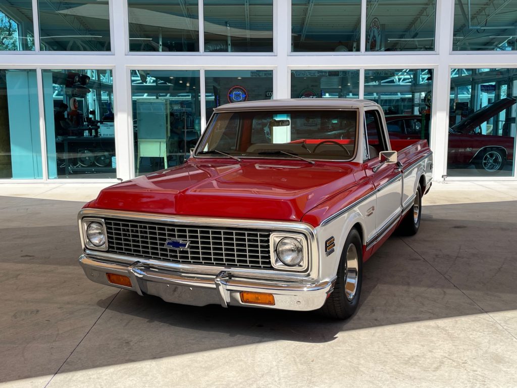 This 1972 Chevrolet C10 Cheyenne Super has undergone a meticulous frame-off restoration, ensuring high-quality craftsmanship. It features the original 402 cubic inch L-47 big block V8 engine, which has been rebuilt and painted orange, including the block, heads, and intake. The engine is paired with a Turbo 400 automatic transmission and a GM 12-bolt rear axle. It also includes a factory air cleaner with a chrome lid, a four-barrel carburetor, power steering, and power disc brakes.
