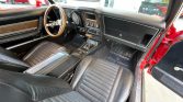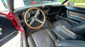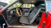 Inside, the Mach 1 features a sleek black sports bucket seat interior. It includes a console with storage, a chrome shifter with a wood T-Shift handle, and black door panels with wood grain trim. The interior is further highlighted by black carpet, a headliner, and a factory dash with an electric clock, AM-FM radio, and factory tachometer. Black floor mats, seatbelts, and a wood-rim steering wheel complete the refined look.