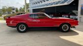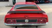 The exterior is finished in a vibrant red paint job, accentuated by a Ram Air hood with a dual scoop design. The hood features a matte black paint treatment that complements the red body. Black Mach 1 decals, a correct factory rear deck spoiler, and a front spoiler enhance the aggressive styling of this classic muscle car.