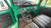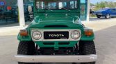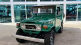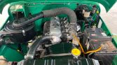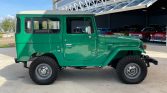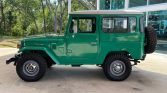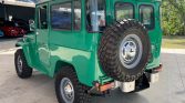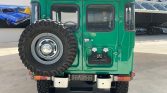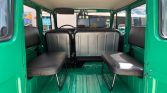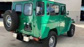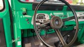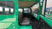 Inside, the Land Cruiser boasts a brand-new interior with grey front twin bucket seats and matching jump seats. The dash is painted in the same green as the body, housing the correct factory gauges and controls. Other interior features include a black steering wheel, grey rubber floor mat, and a green-painted rear cargo area. The manual stick shifter is easily accessible for an authentic driving experience.